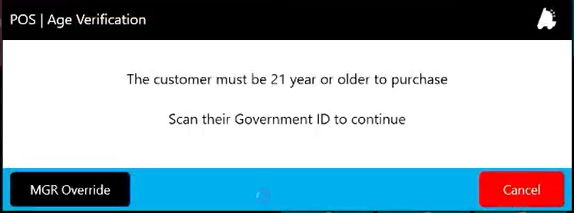 The following screen will appear, requiring either an ID scan or a manager override before the age-restricted item can be sold.