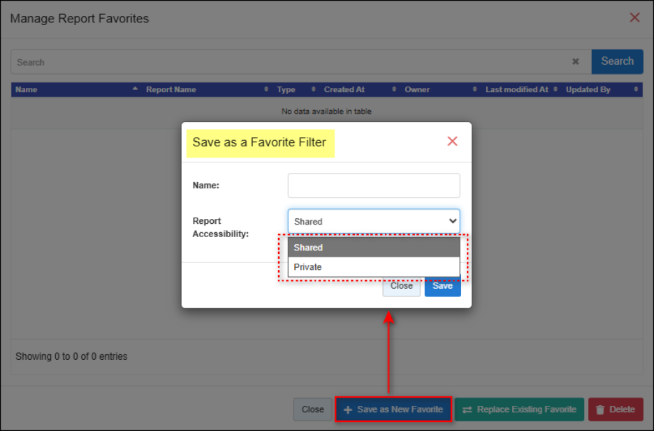 - Shared: The favorite report is visible to all users under the same account. Any user can view and use the saved configuration, but only the owner can modify or delete it.