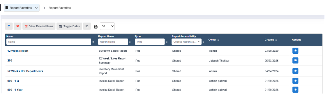 - Owner: Displays the name of the user who originally created the favorite report. Ownership determines permission to replace or delete the favorite. Only the Owner has the authority to modify or remove it.