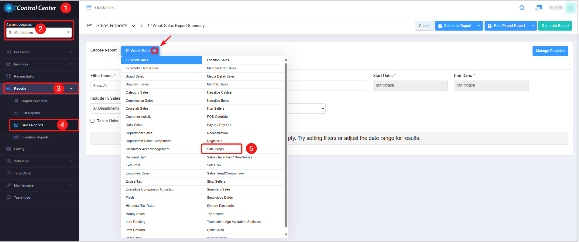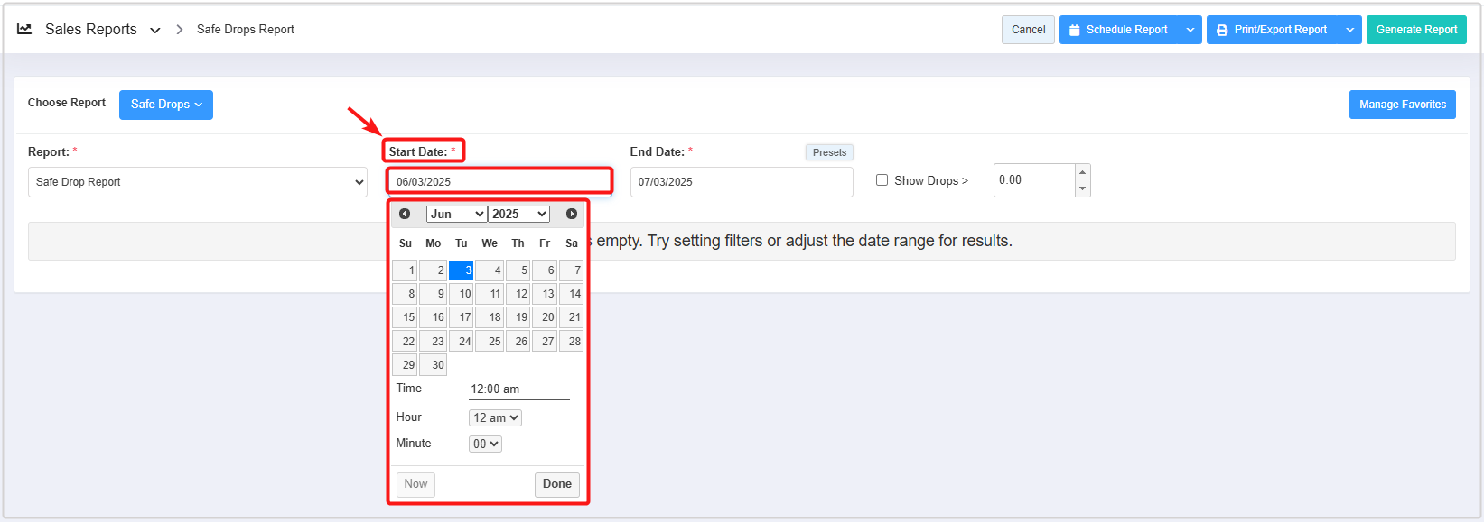 - Select the date range and click "Generate Report" to view the "Safe Drops Report" for the selected date range.
