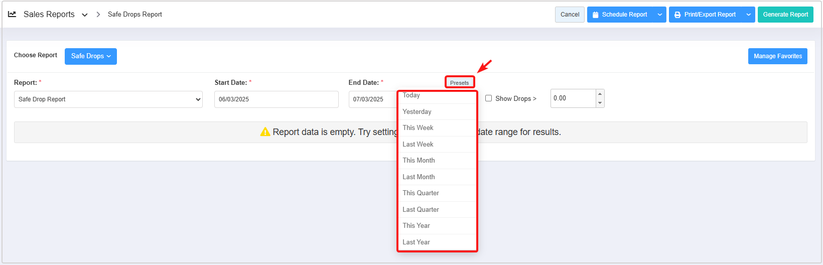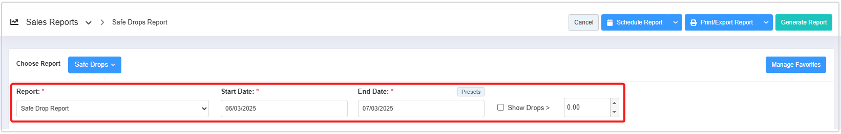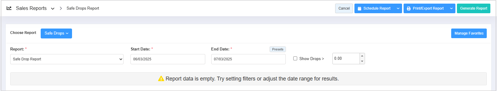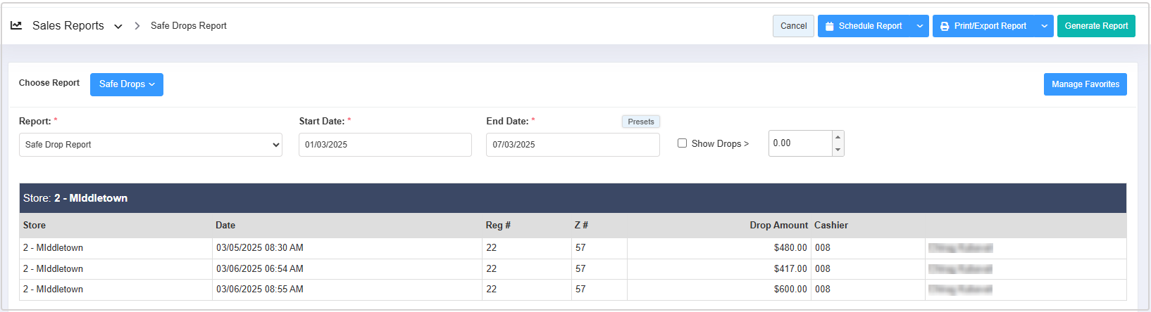 - Safe Drops: This option lets you view the safe drops performed during the selected date range.