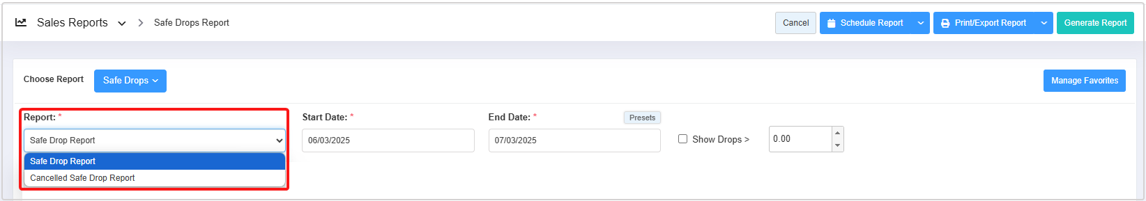 The Report filter lets you view the Safe Drops Report based on two parameters: Safe Drops and Cancelled Safe Drops.