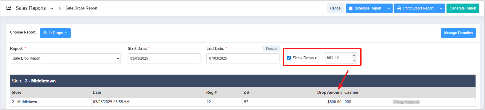The Show Drops filter lets you view the safe drop records greater than the specified amount.
