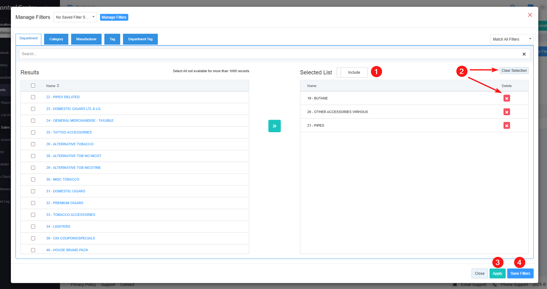 - 3: Parameters Tabs: You will see five tabs: Department, Category, Manufacturer, Tag, and Department Tag. Select the required tab, i.e., "Department," to create or apply a custom filter specific to the selected departments.