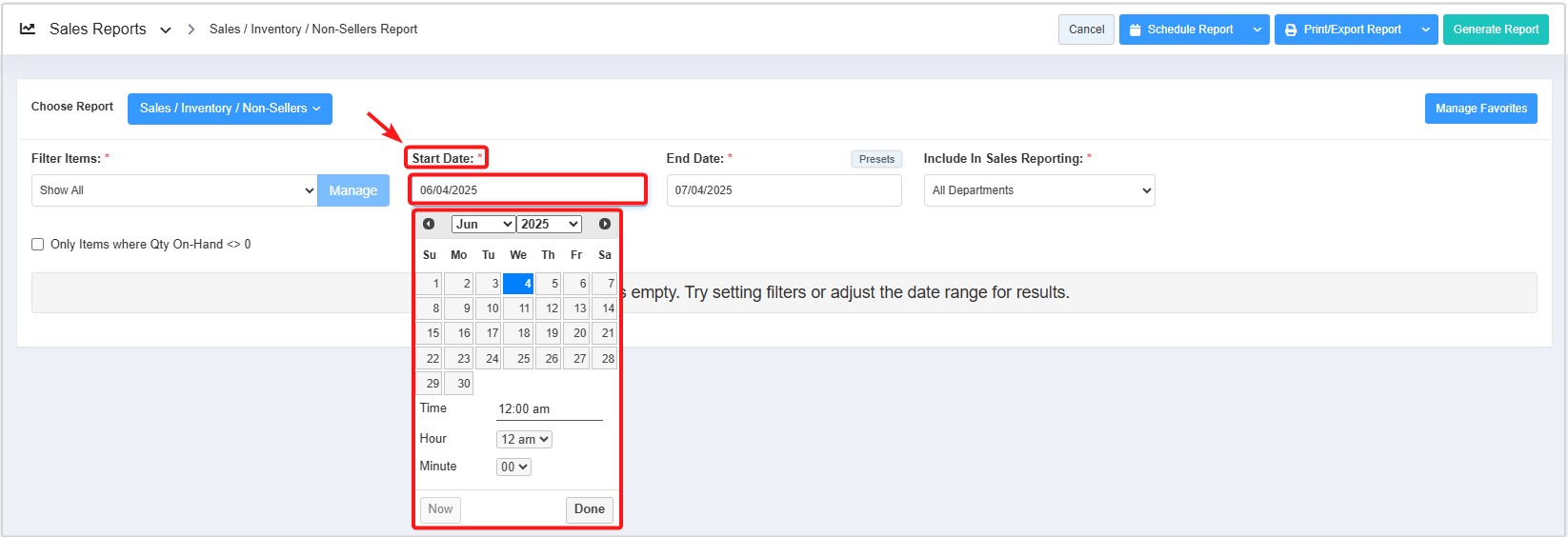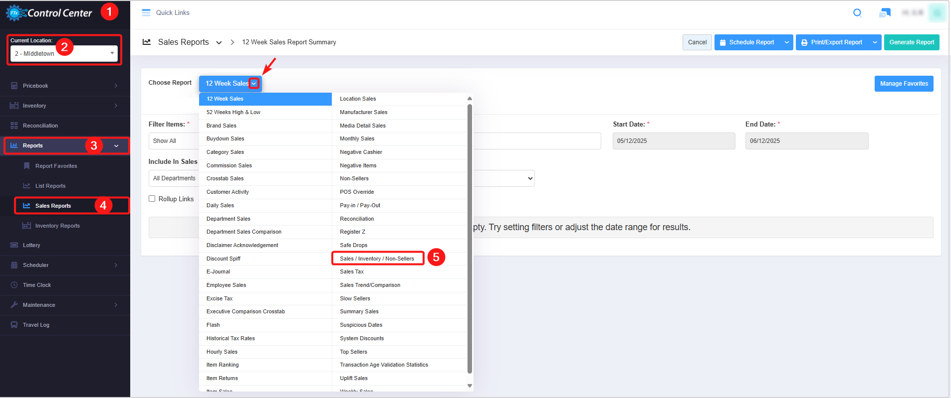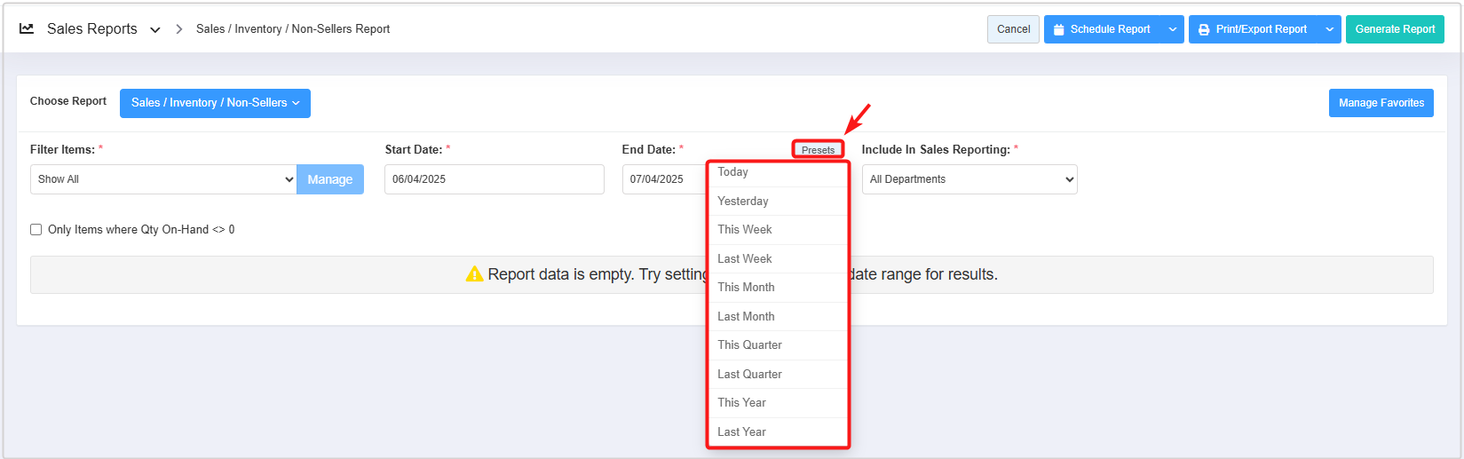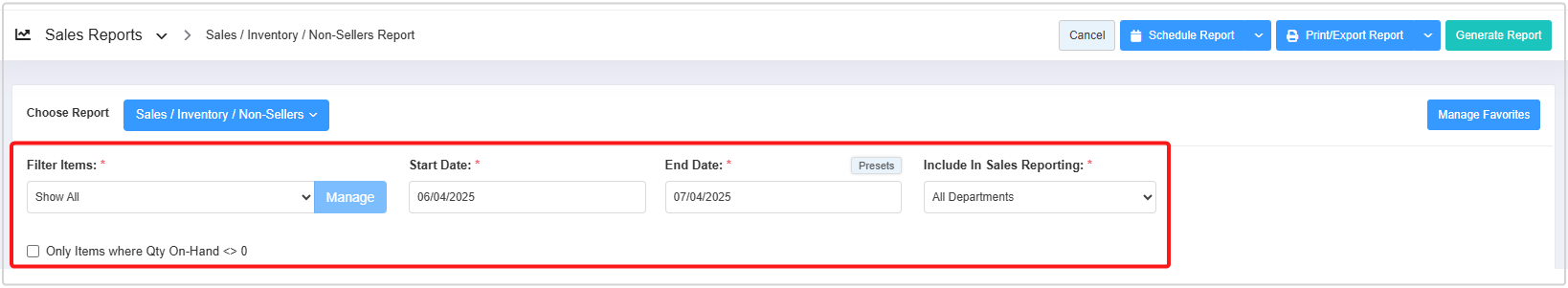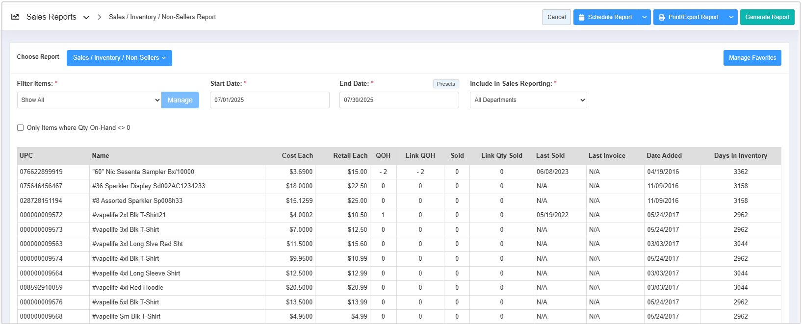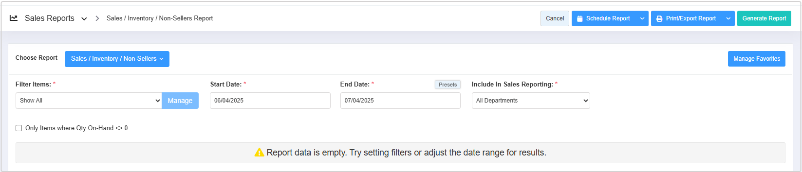 - Navigate to the Sales / Inventory / Non-Sellers Report screen.