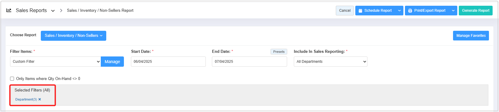 - Click on the filter's name, and then click on the "Select Filter" button. The system will close the "Manage Saved Filters" pop-up screen. Next, click the "Apply" button on the "Manage Filters" screen. The system will navigate you to the Sales / Inventory / Non-Sellers Report home screen. Click "Generate Report" to generate the report for the selected filter.