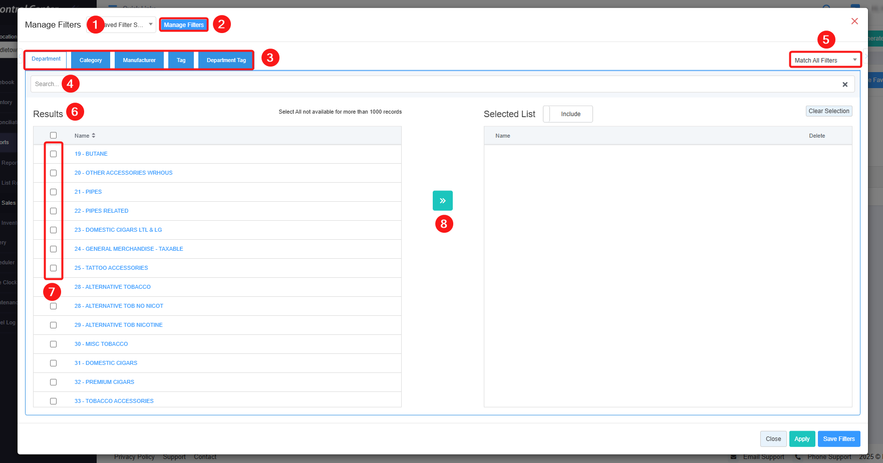 - 5: Match All Filters Drop-Down: This filter has two options: "Match All Filters" and "Match Any Filters." Select either option to determine whether the Manage Filters screen data matches all applied filters. This drop-down is useful when you use multiple parameter tabs. For example, you choose a few manufacturers from the "Manufacturer" tab and a few departments from the "Department" tab.