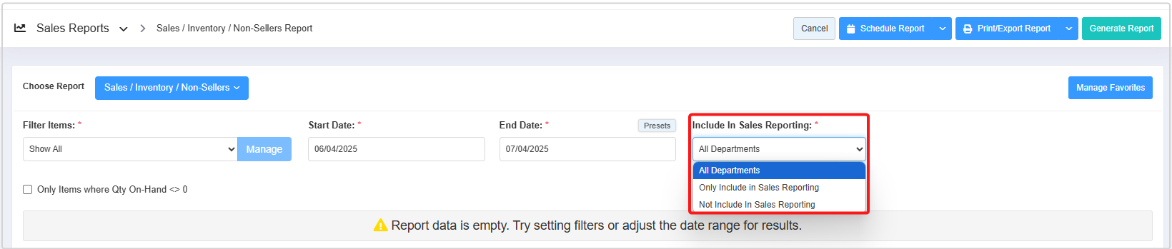 The Include In Sales Reporting drop-down allows you to filter the report records based on three parameters: All Departments, Only Include in Sales Reporting, and Not Include In Sales Reporting.