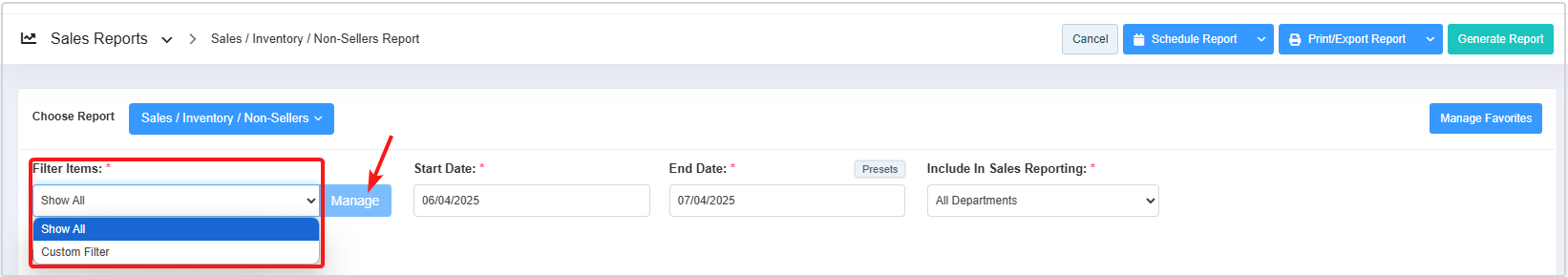 - 1: Saved Filters Drop-Down: Select the saved custom filters from the Manage Filters drop-down (if any) and click "Apply" to apply them. The system will redirect you to the home screen for the Sales / Inventory / Non-Sellers Report. Click "Generate Report" to generate the report for the selected filter.