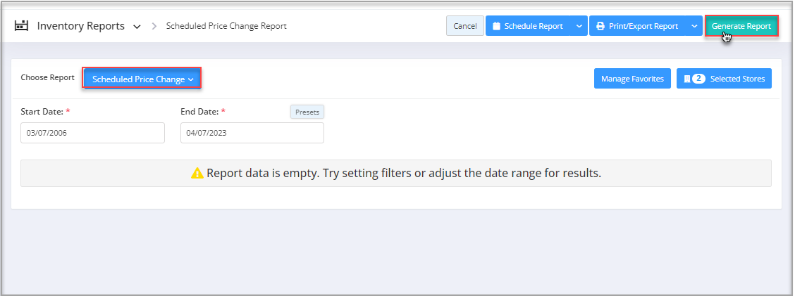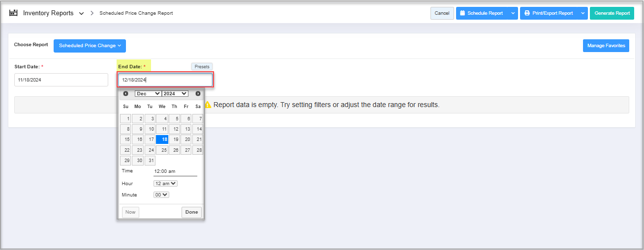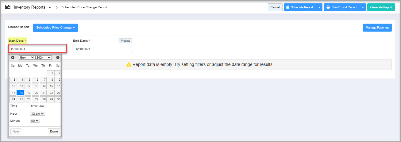 The "Scheduled Price Change Report" displays only the upcoming cost or price changes that have been scheduled for each pricebook zone. It excludes any prices that were manually modified. Users can define a custom date range using the Start Date and End Date fields and apply sorting or filtering preferences to tailor the report output. If no data matches the selected criteria, the system will return a message indicating that the report data is empty. Users are encouraged to refine the filters or adjust the date range for more accurate results.
