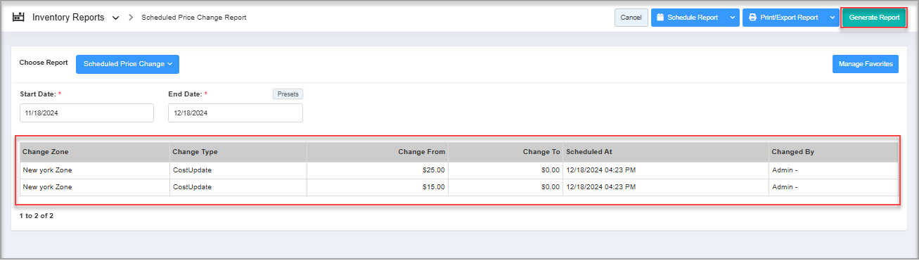 The following data gets fetched in tabular format when you click on the "Generate Report" button in the top right corner; the "Scheduled Price Change Report" will be displayed as highlighted in Figure 3.1.