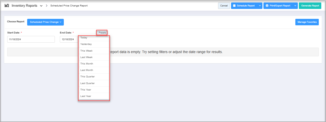 - Presets: The Presets label is provided to select the specific duration/interval to generate the "Scheduled Price Change Report" according to the selected time period.