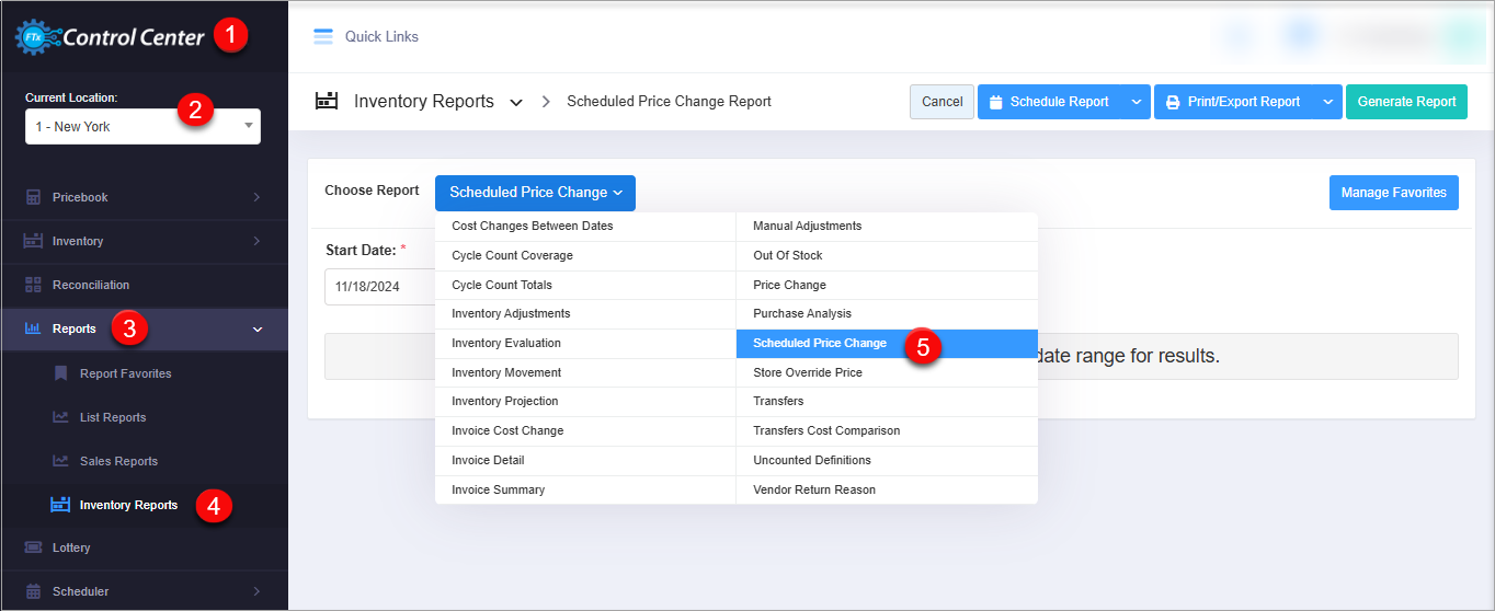 To generate the "Scheduled Price Change Report," follow the steps below. (See Figure 2.1 above.)