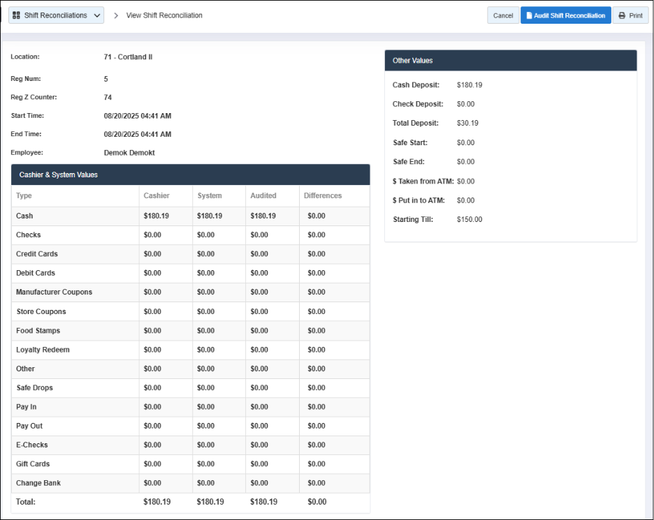 - Audited: This column indicates whether the shift reconciliation has completed the audit process.