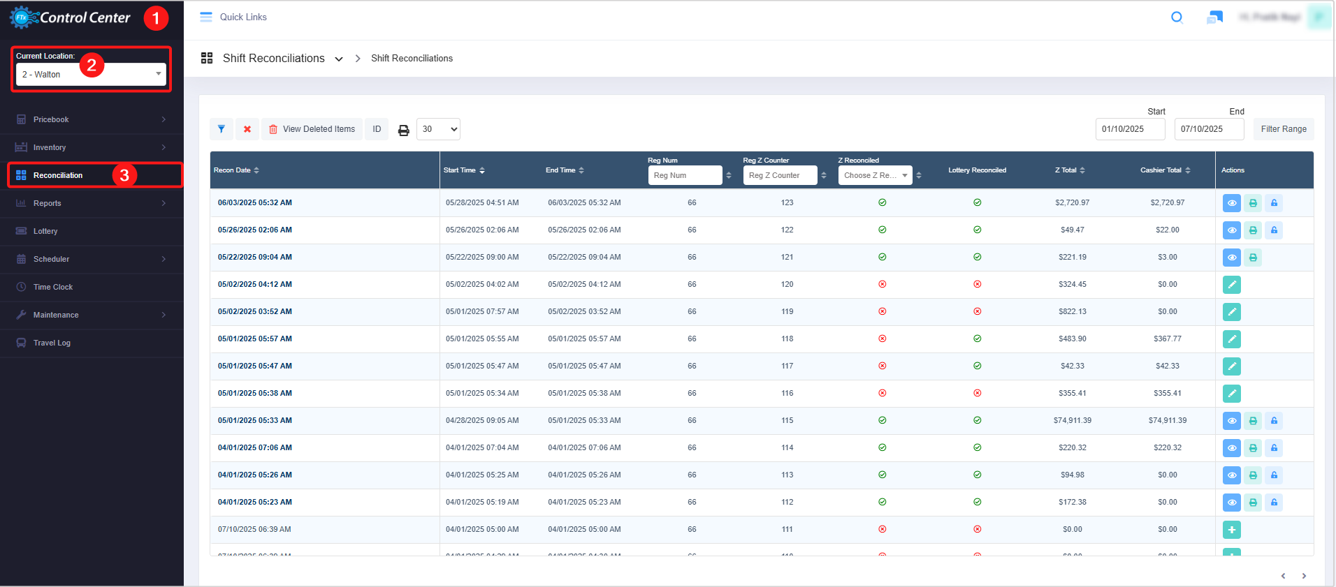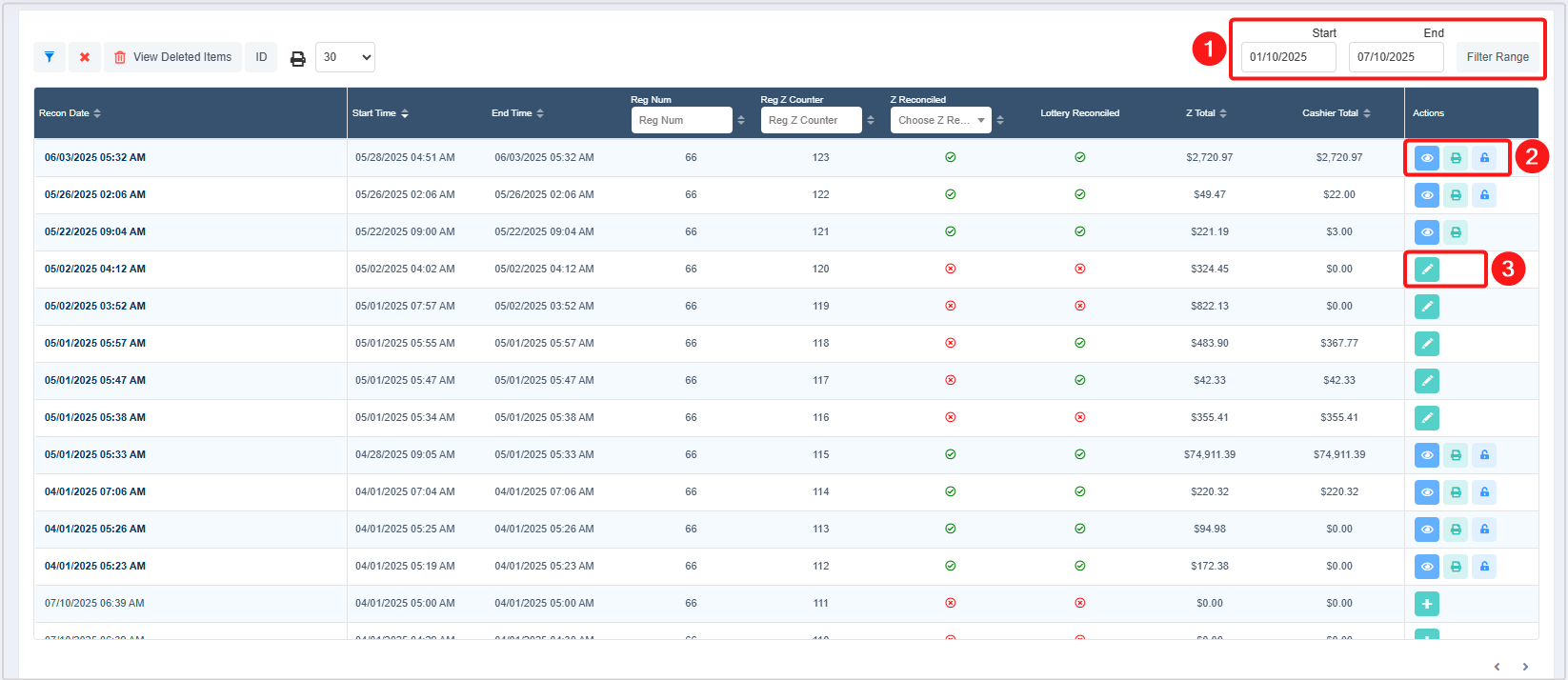 - 1: Filter Range: This section specifies the date range to view the shift reconciliation records. Enter the required dates in the Start and End fields and click the "Filter Range" button to view the shift reconciliations performed during the specified date range.