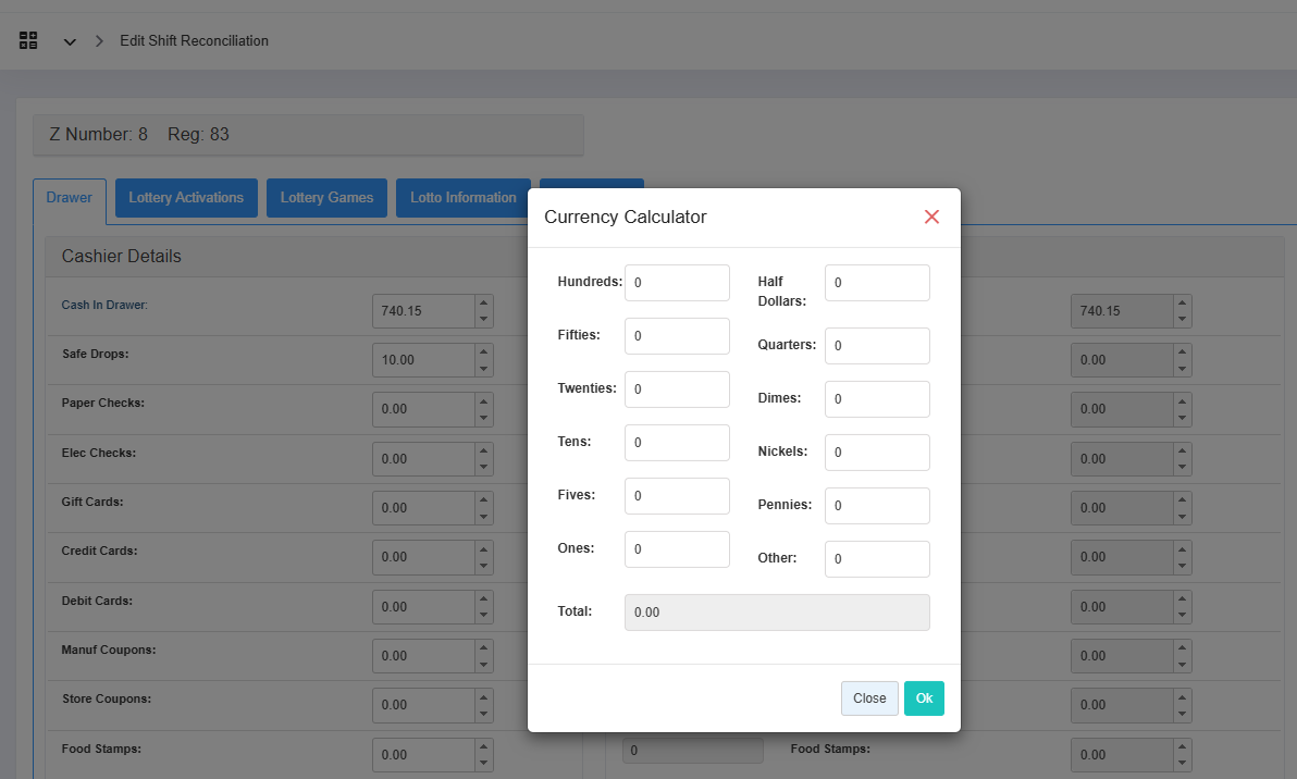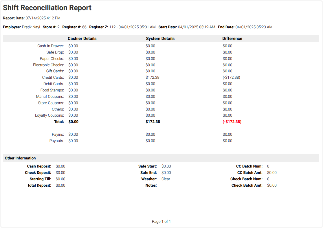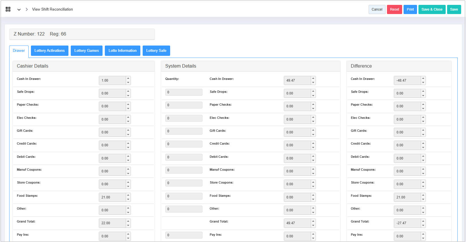 - Shift Reconciliation: Shift Reconciliation is the process performed at the end of a cashier's shift to verify and balance the transactions handled during their working hours. It involves comparing the POS-recorded sales and cash amounts with the cash in the drawer and other payment totals (like credit cards, gift cards, etc.). This ensures the cashier's records are accurate and helps detect discrepancies, cash shortages, or overages before the next shift begins. Shift Reconciliation is commonly known as "Register Z."