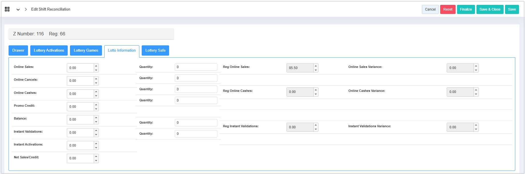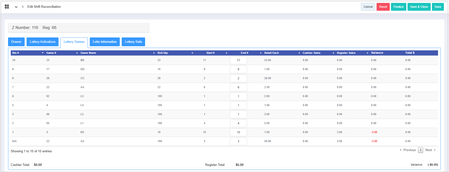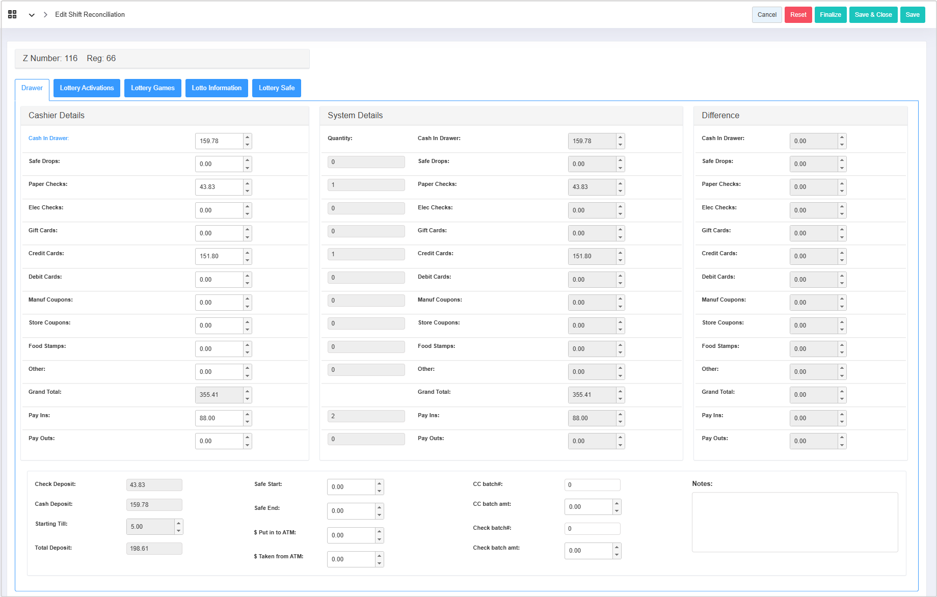 - Shift Reconciliation: Shift Reconciliation is the process performed at the end of a cashier's shift to verify and balance the transactions handled during their working hours. It involves comparing the POS-recorded sales and cash amounts with the cash in the drawer and other payment totals (like credit cards, gift cards, etc.). This ensures the cashier's records are accurate and helps detect discrepancies, cash shortages, or overages before the next shift begins. Shift Reconciliation is commonly known as "Register Z."