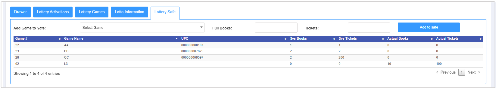 - The Lottery Safe screen will appear. This section shows the list of lottery games available in the safe. Check the values and verify the details.