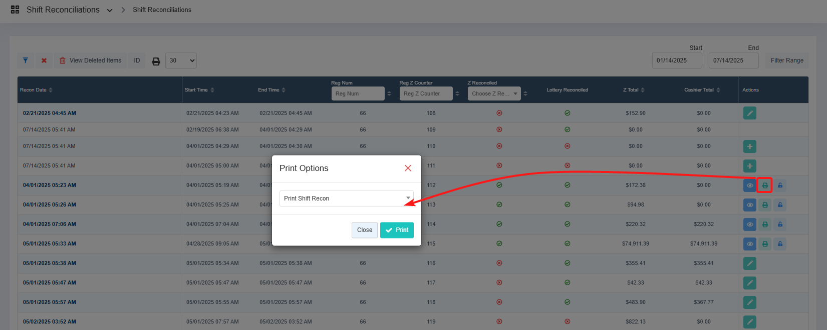 - Click the respective Print icon for the shift reconciliation you want to print.