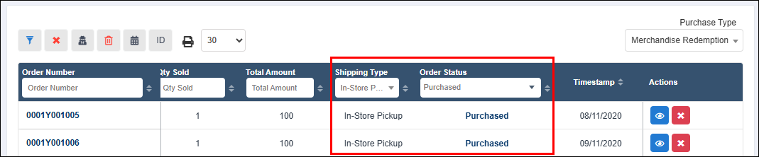 - The item will be listed with the Shipping Type as In-Store Pickup and the status as Purchased under the Order Status column.