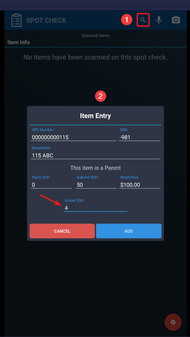 - 1: Search Item: Click the search icon and enter the item's UPC you need to count.