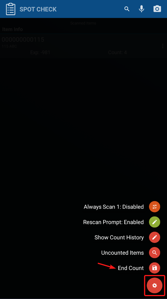 - To end the spot checks, click the Settings icon highlighted in Figure 4.2.10, and next click "End Count."