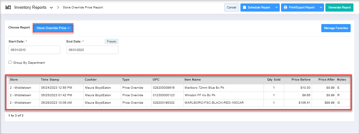 - Cashier: This column displays the name of the cashier who overrode the price of any item at the store.