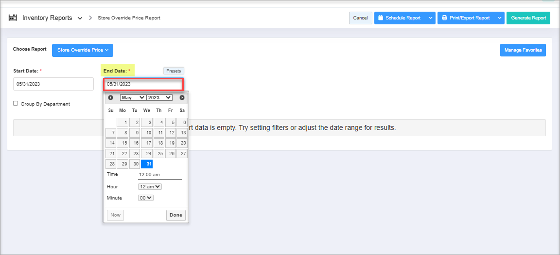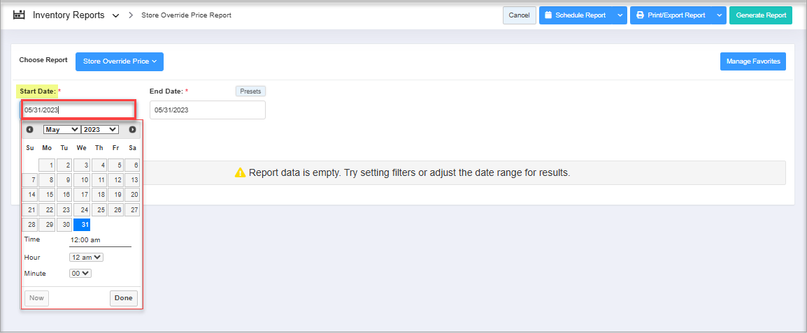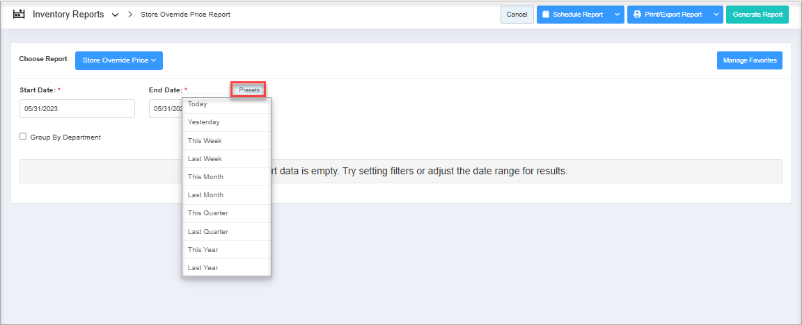 Presets: The Presets drop-down menu is provided to select the specific duration/interval to generate the "Store Override Price Report" according to the selected time period.