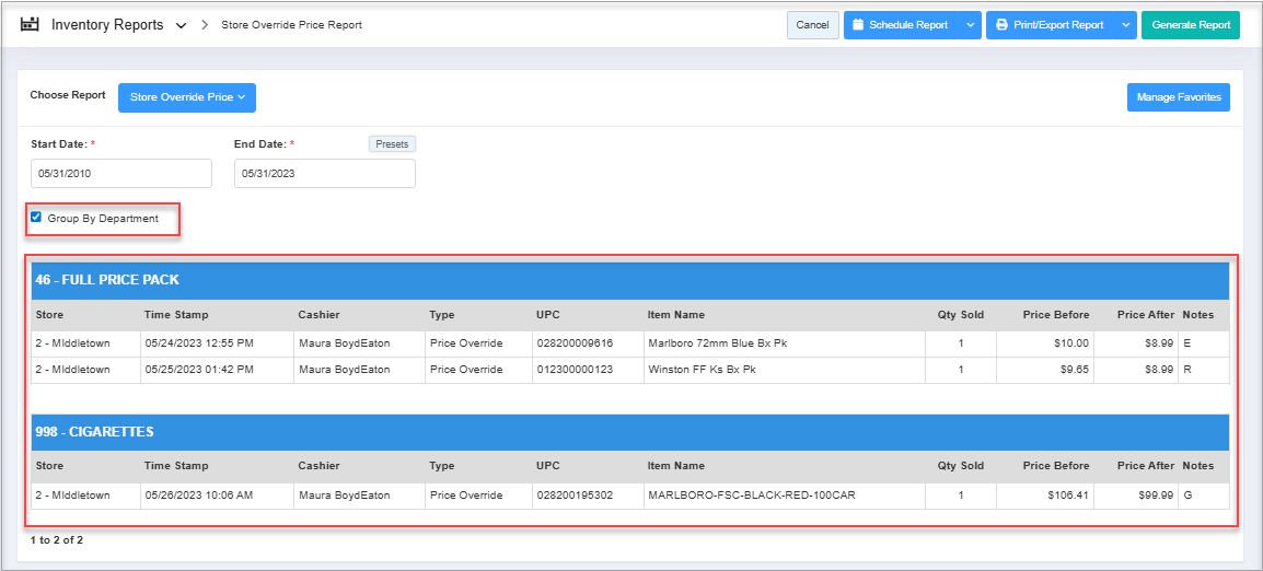 For more precise insights, the report can be grouped by store and department, allowing users to analyze override patterns and pricing adjustments more effectively.