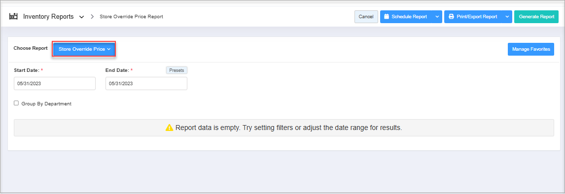 By clicking "Store Override Price Report," you will be redirected to the "Store Override Price Report," where you can see relevant filtering and sorting options.