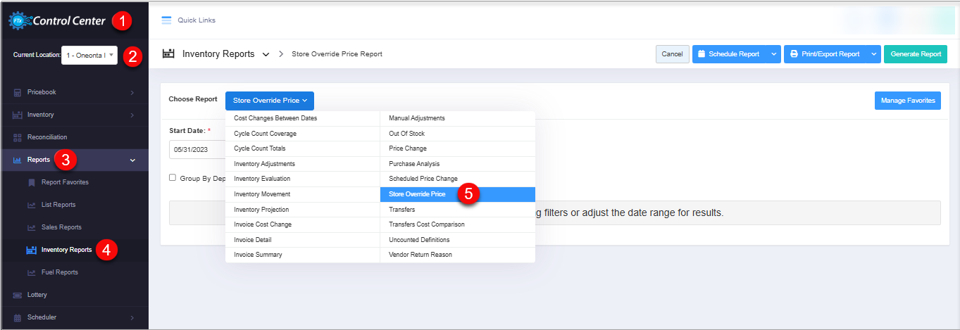 To generate the "Store Override Price Report," follow the steps below. (See Figure 2.1 above.)