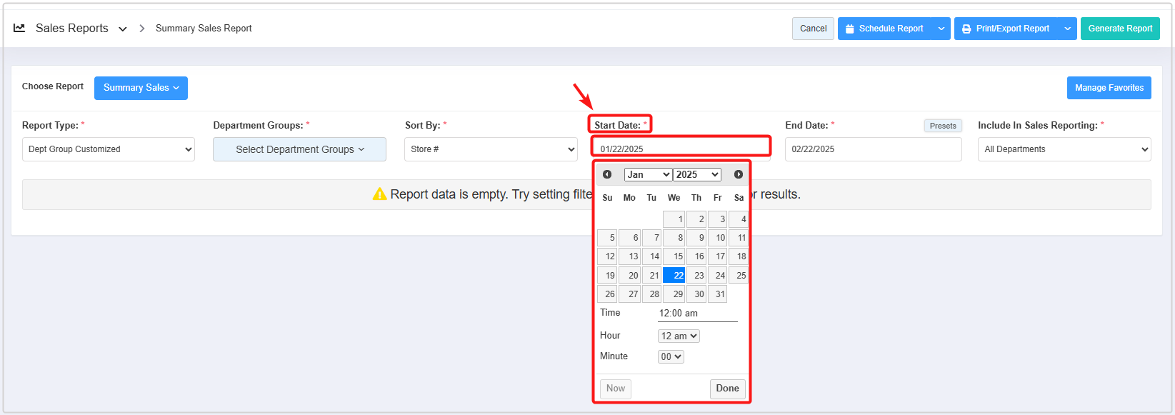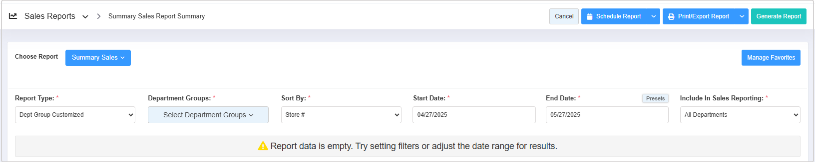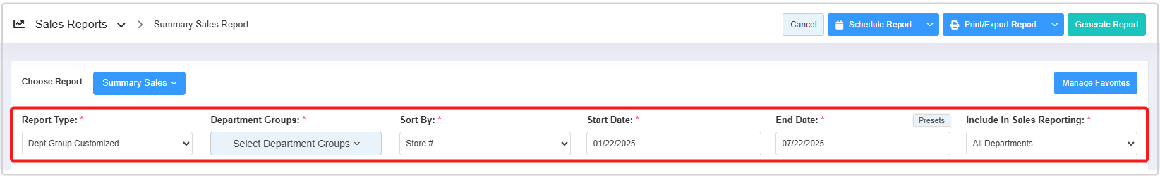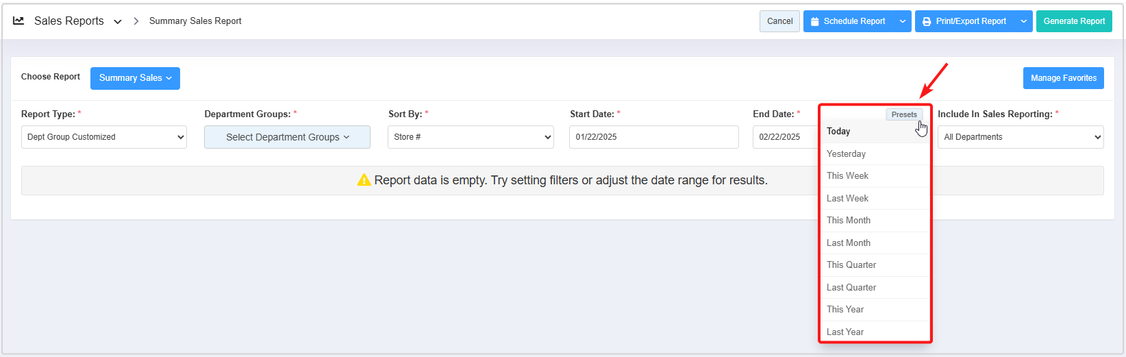 - Based on your requirements, you can use the Report Type, Department Groups, Sort By, Date Range & Presets, and Include In Sales Reporting filters. You can use multiple filters to make the report more specific. For more information, please refer to Section 3. "Report Filter Options."