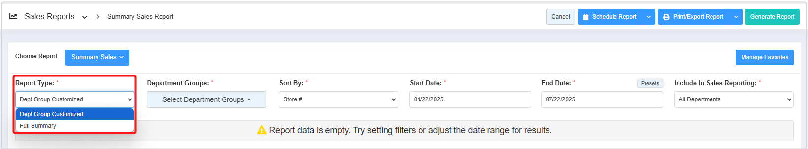 The Report Type filter lets you generate two types of reports: Dept Group Customized and Full Summary.