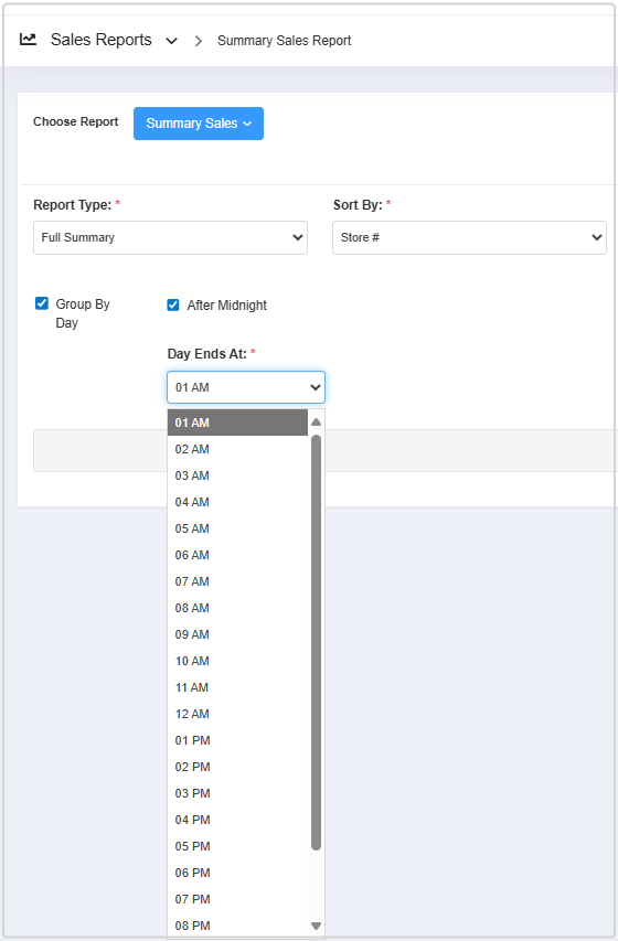 - Typically, a day runs from 00:00 to 23:59. However, you can select a different end time to analyze sales data over a different time frame.