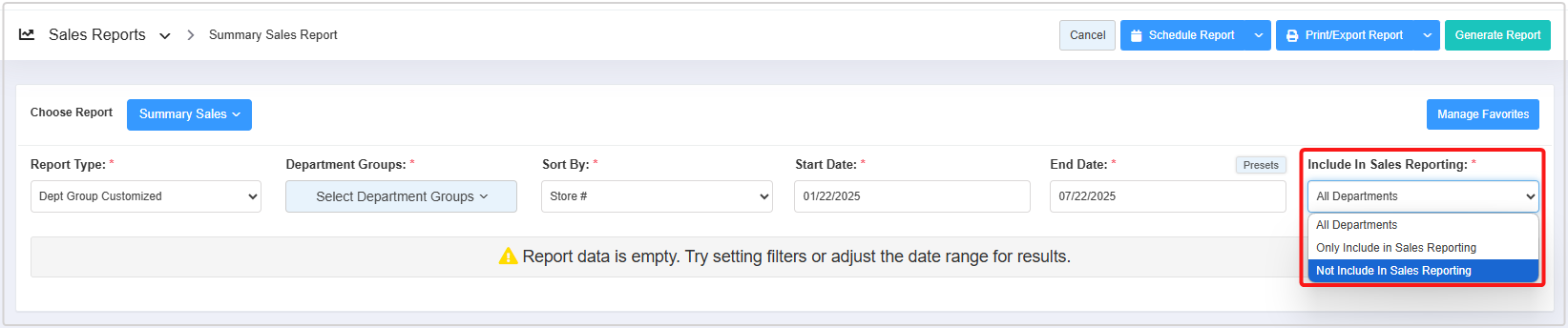 The Include In Sales Reporting drop-down allows you to filter the report records based on three parameters: All Departments, Only Include in Sales Reporting, and Not Include in Sales Reporting.
