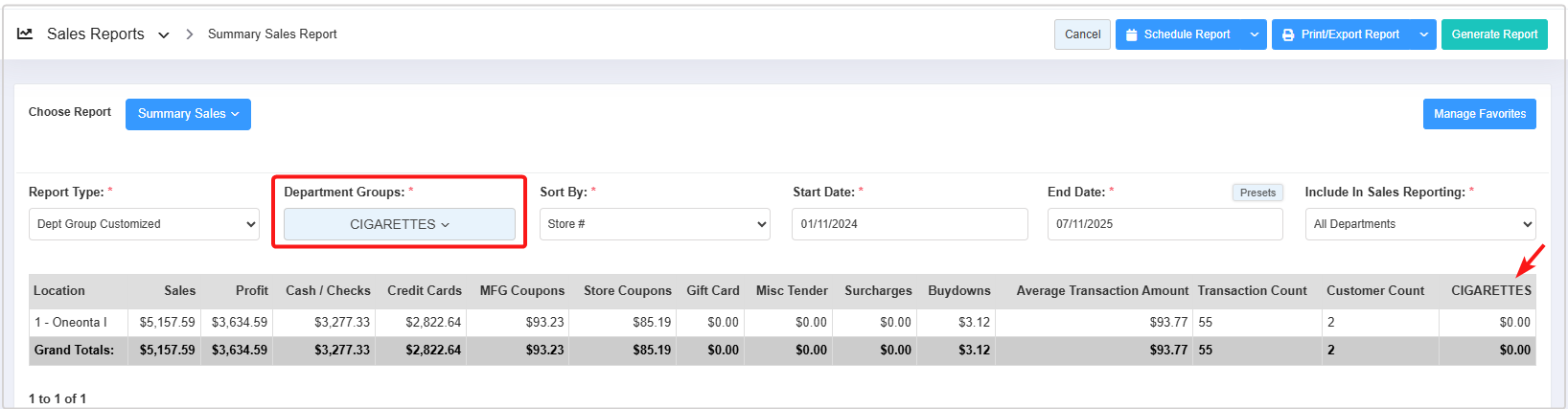 The Department Groups filter drop-down lets you select the specific department groups to view the report. It lists all location groups available to the store you have selected in the Left Panel. The system shows all departments by default. However, you can click the drop-down menu, select the required department group, and click "Generate Report" to view the report only specific to that group(s). For instance, Figure 2.1.1 below displays the report specifically for the CIGARETTES department group.