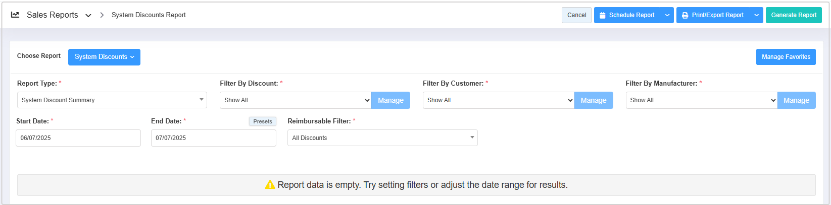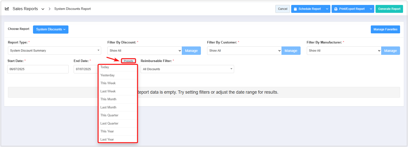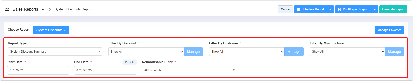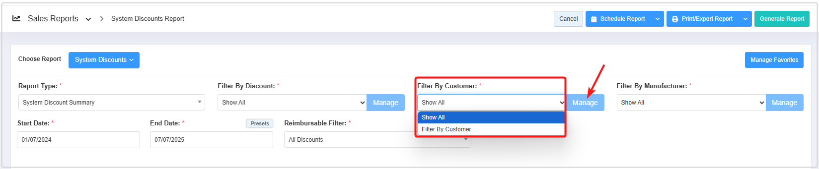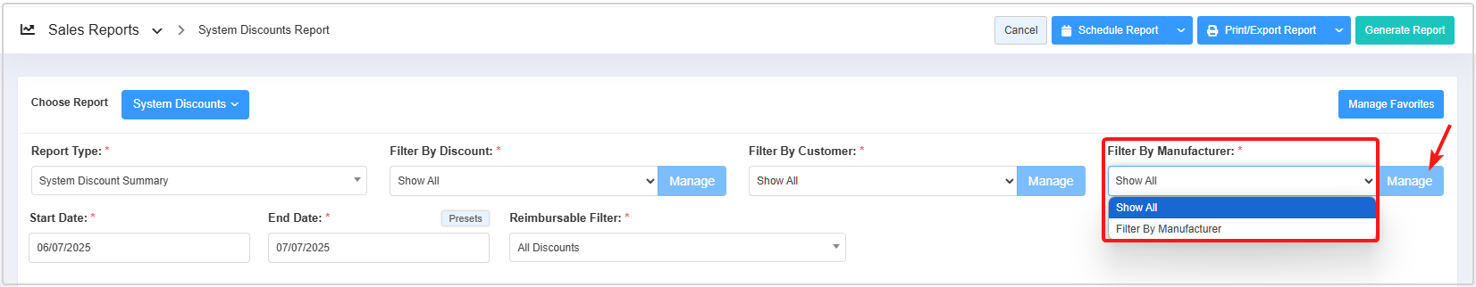 - You can use the Report Type, Filter By Discount, Filter By Customer, Filter By Manufacturer, Date Range & Presets, and Reimbursable Filter filters to create the report that meets your requirements. You can use multiple filters to make the report more specific. Please refer to section 3. Report Filter Options, to learn more about these filters.