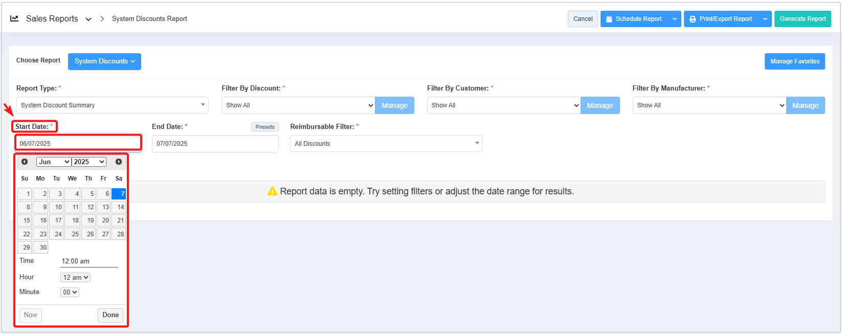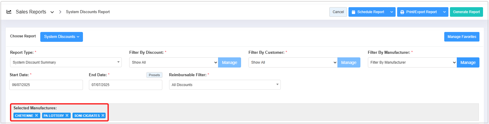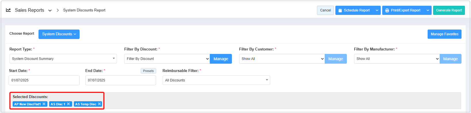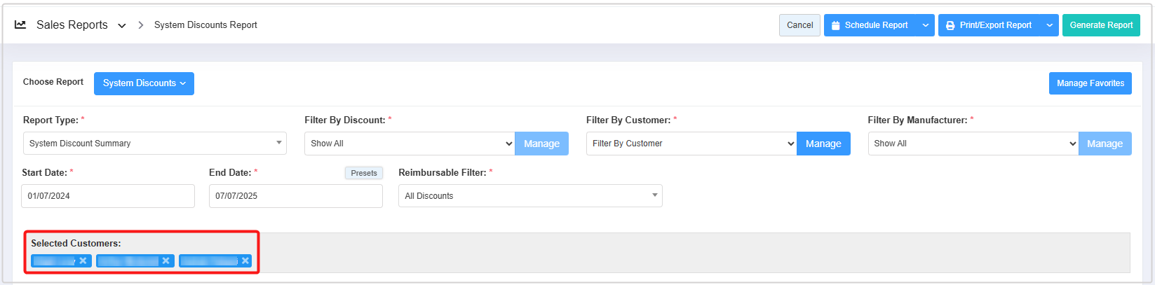 - You can use the Report Type, Filter By Discount, Filter By Customer, Filter By Manufacturer, Date Range & Presets, and Reimbursable Filter filters to create the report that meets your requirements. You can use multiple filters to make the report more specific. Please refer to section 3. Report Filter Options, to learn more about these filters.