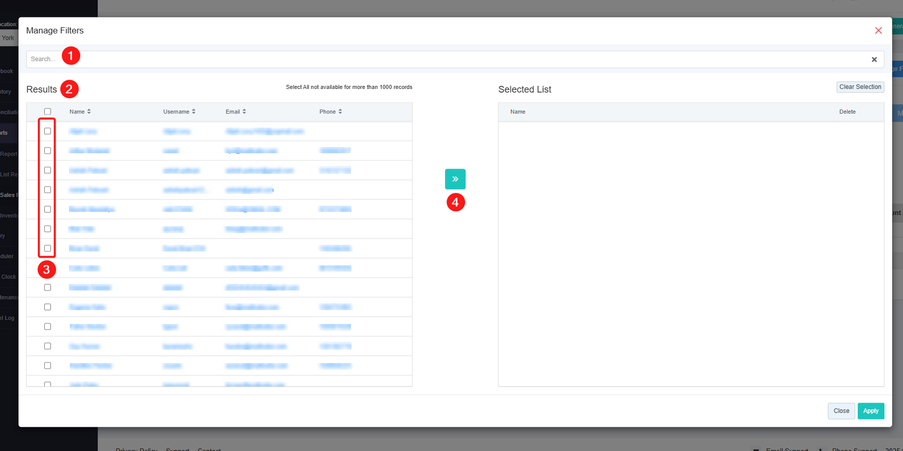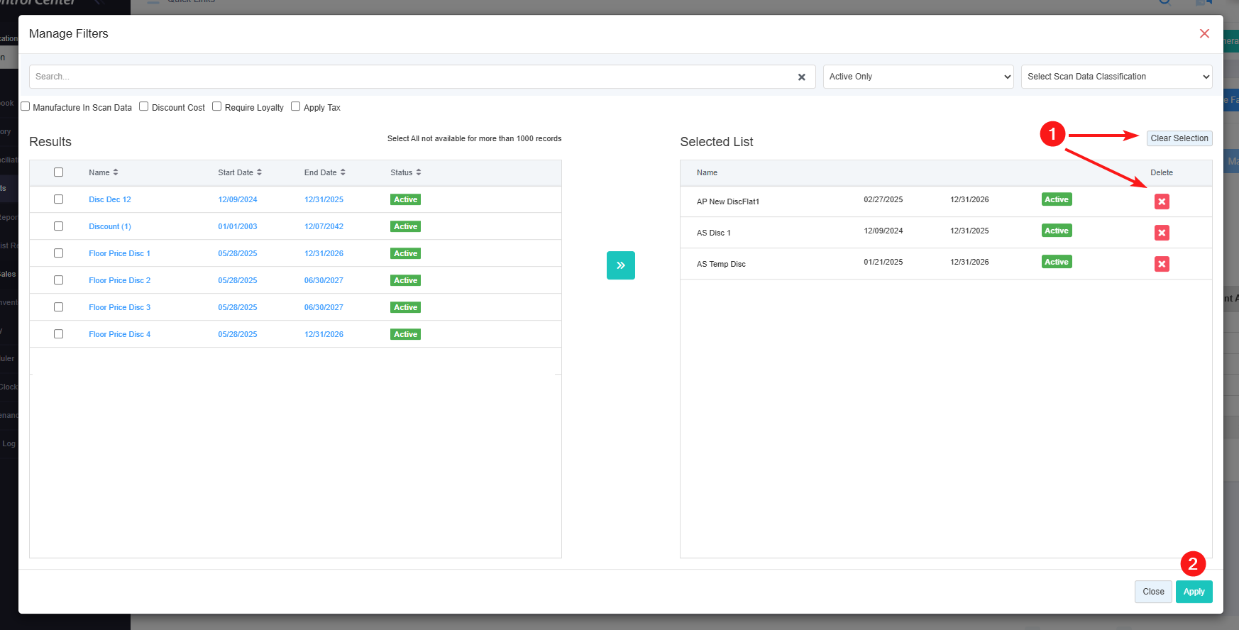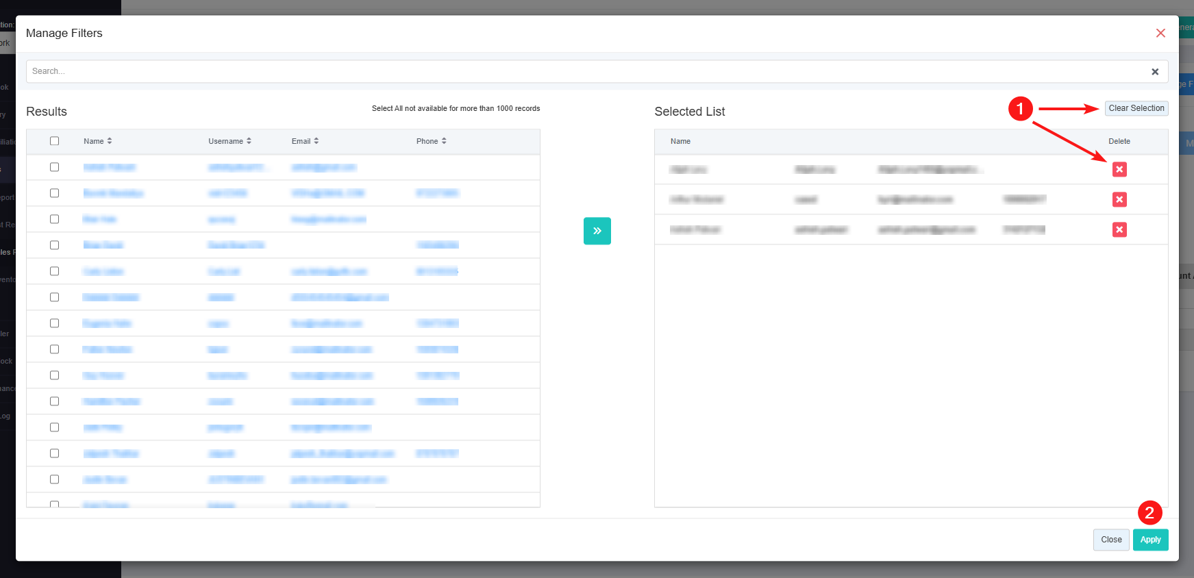 - 1: Clear Selection: Click the "Clear Selection" button to remove the whole selection. To remove any record from the list, click the Remove (x) icon.
