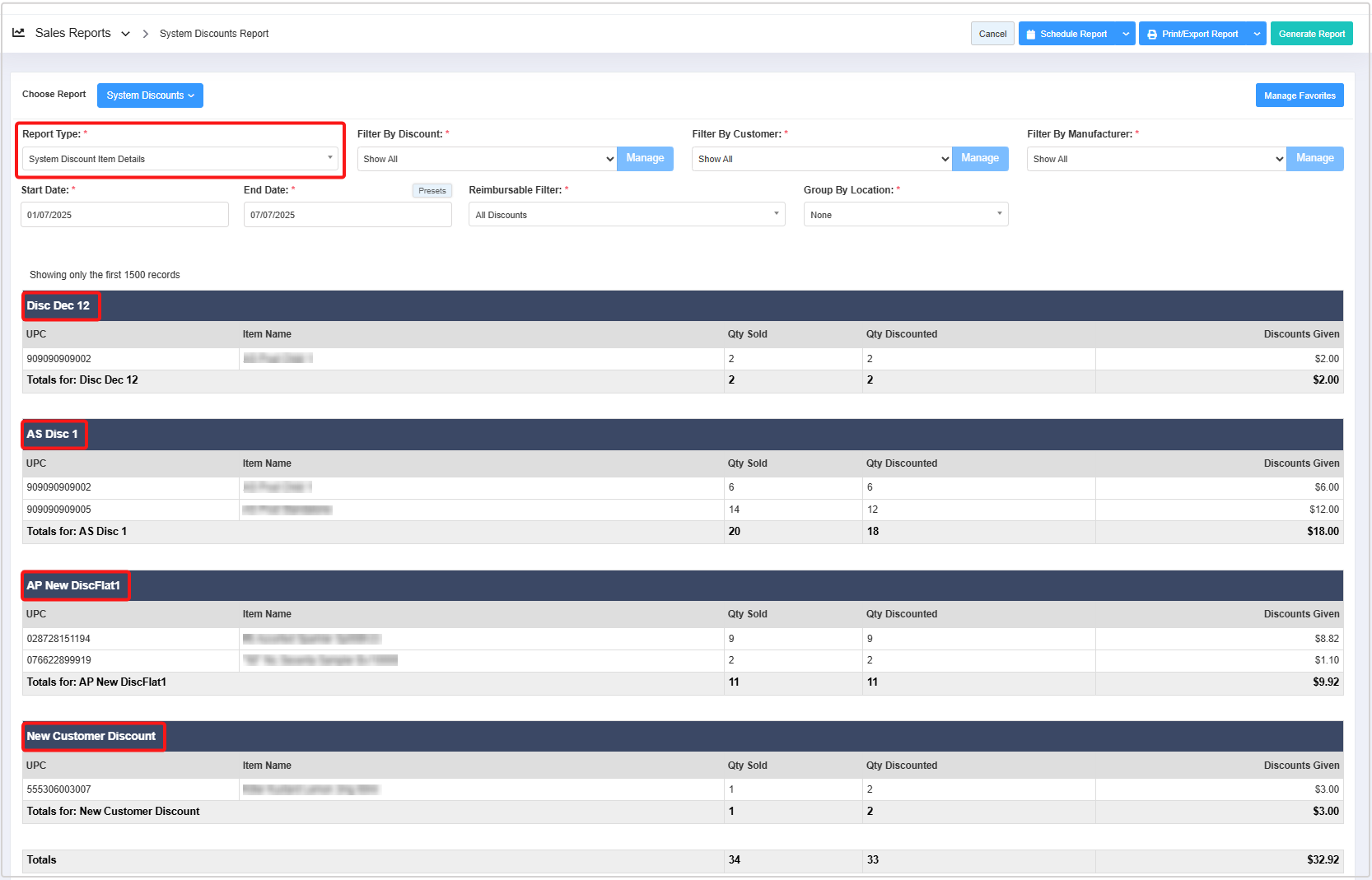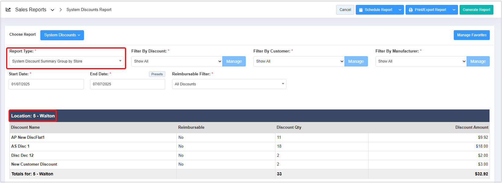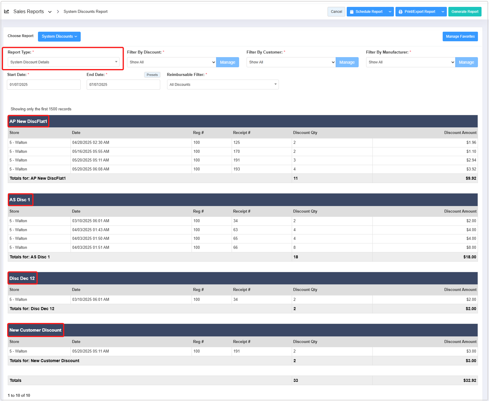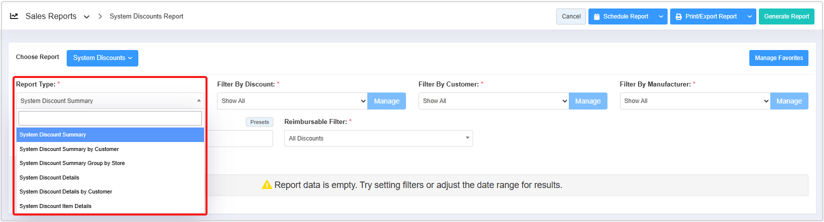 - Report Type: The Report Type filter lets you generate six reports: System Discount Summary, System Discount Summary by Customer, System Discount Summary Group By Store, System Discount Details, System Discount Details by Customer, and System Discount Item Details. Section 3.1 Report Type explains further details.
