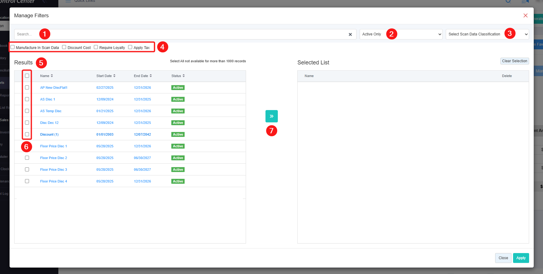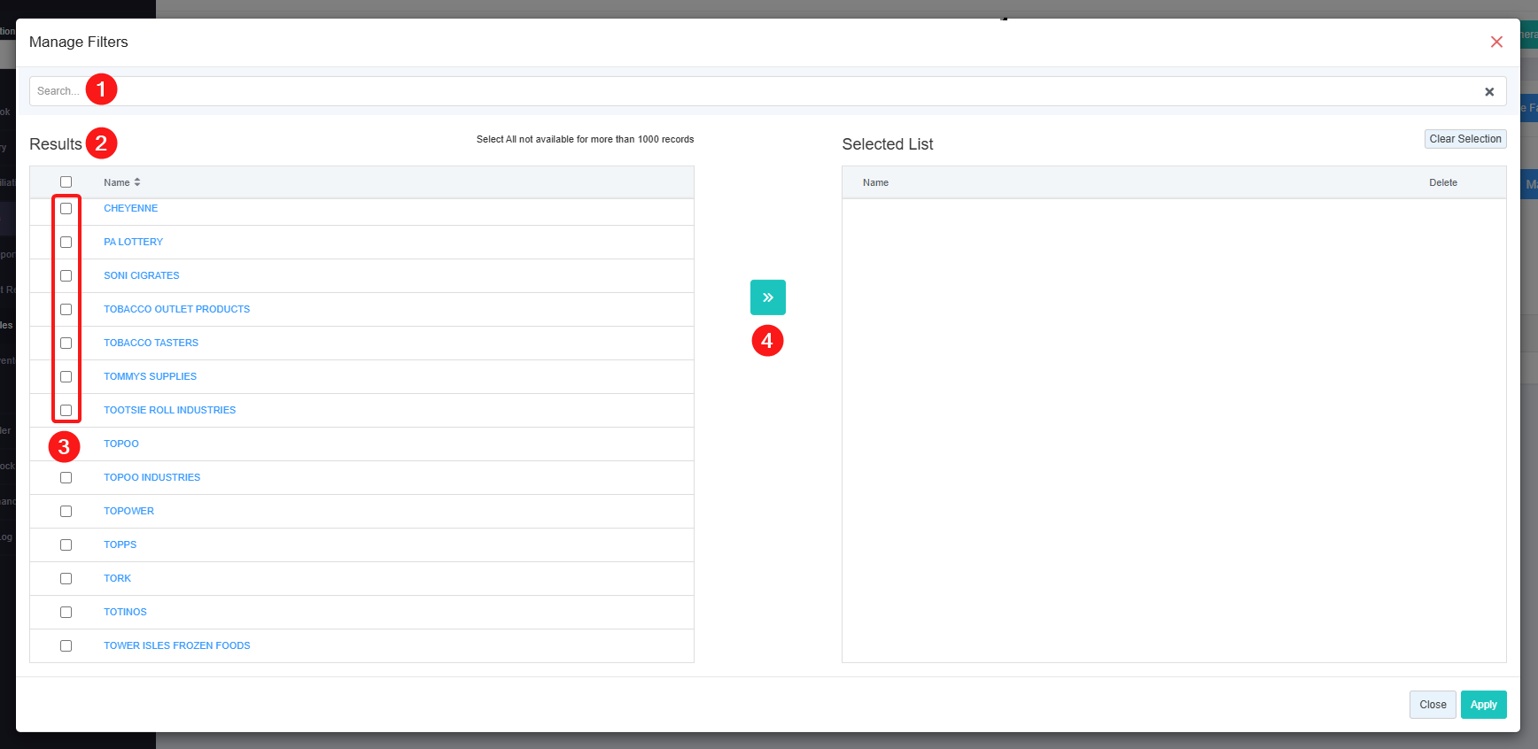- 4: Custom Selections: Use these checkbox filters to filter the Manage Filter screen data based on four parameters: