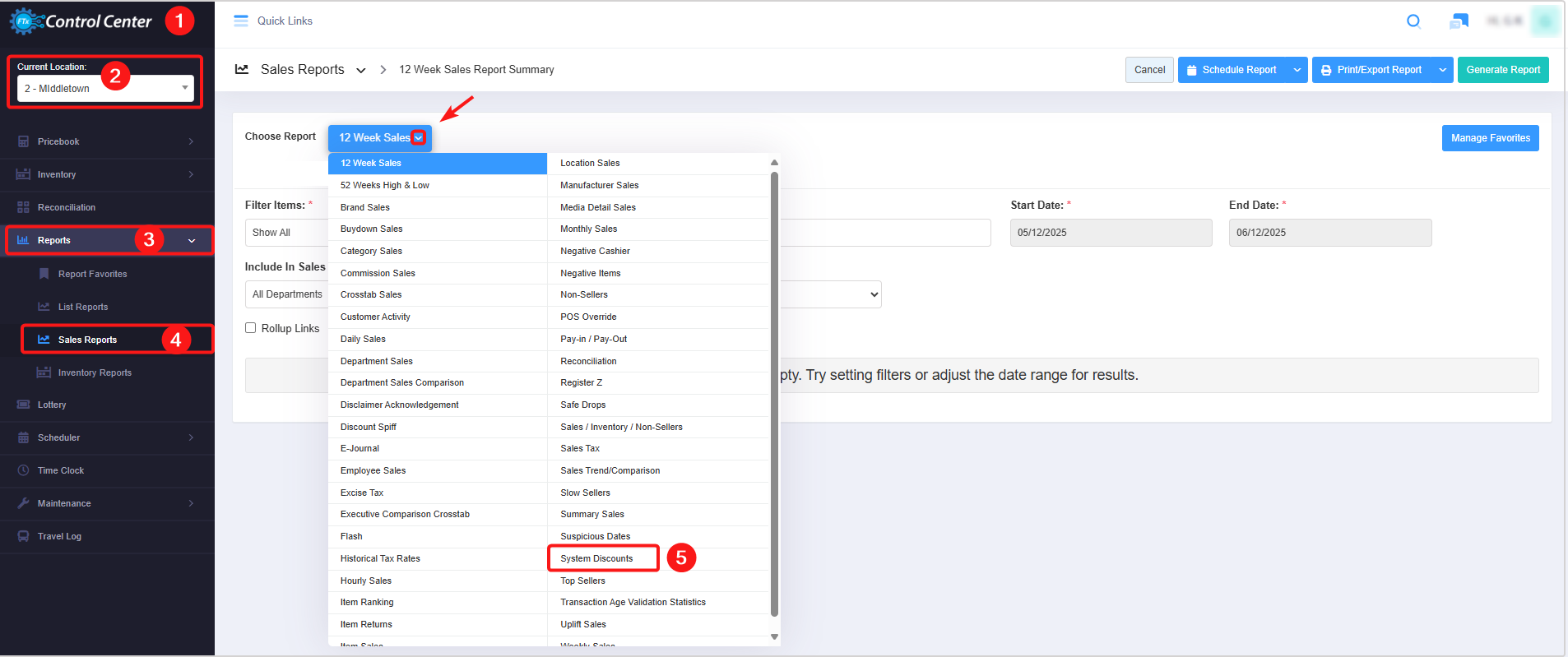 - Select the date range and click "Generate Report" to view the "System Discounts Report" for the selected date range.