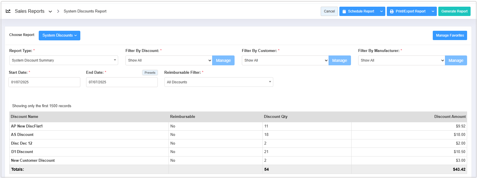 When you click "System Discounts," the System Discounts Report screen will open. As shown in Figure 1.2, it provides relevant filtering and sorting options.