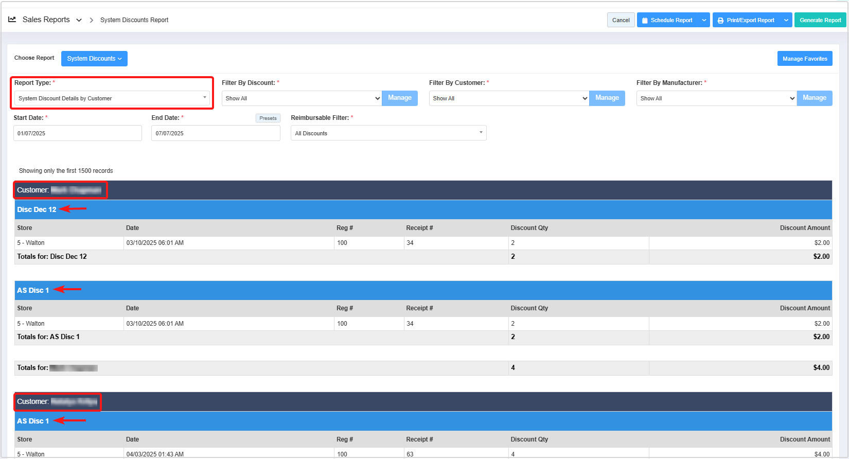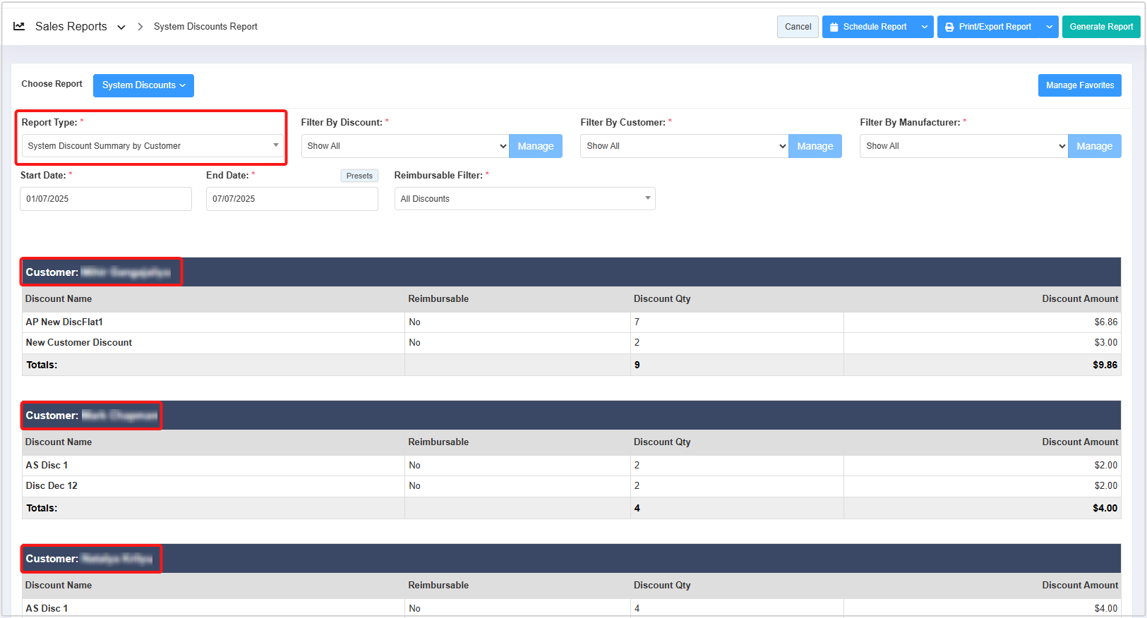 - System Discount Details by Customer: This report type generates a report organized by customer names and discount details, as Figure 3.1.5 shows. It shows all discounts availed by the customer within the chosen date range and specific details about each discount.