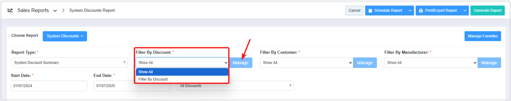 - In the Filter By Discount drop-down, select the "Filter By Discount" option and click the "Manage" button.