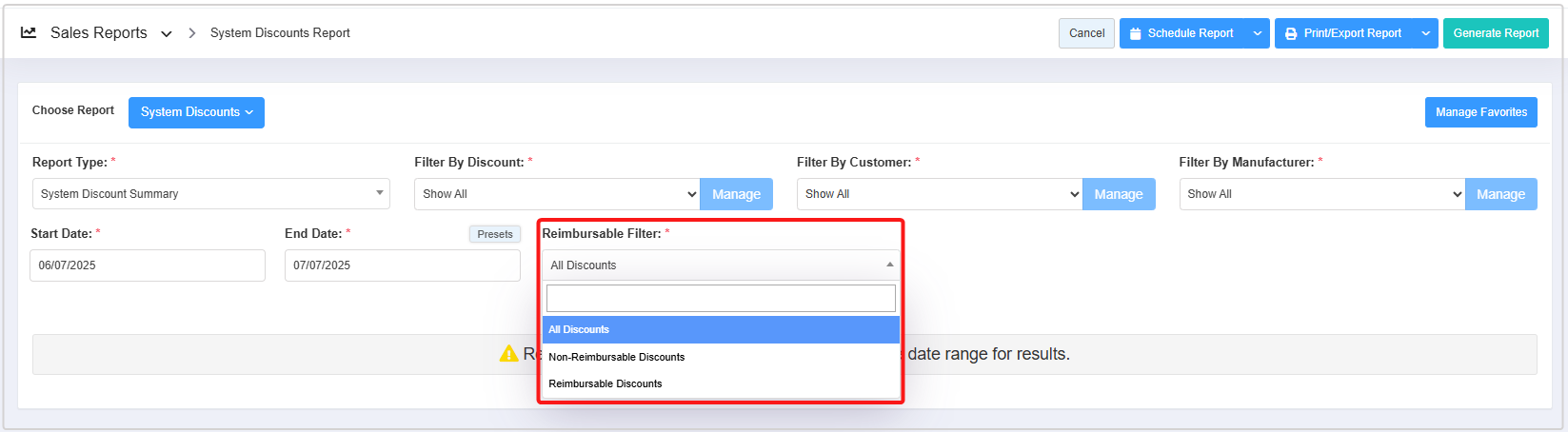The Reimbursable Filter drop-down lets you filter the report records based on three parameters: All Discounts, Non-Reimbursable Discounts, and Reimbursable Discounts.