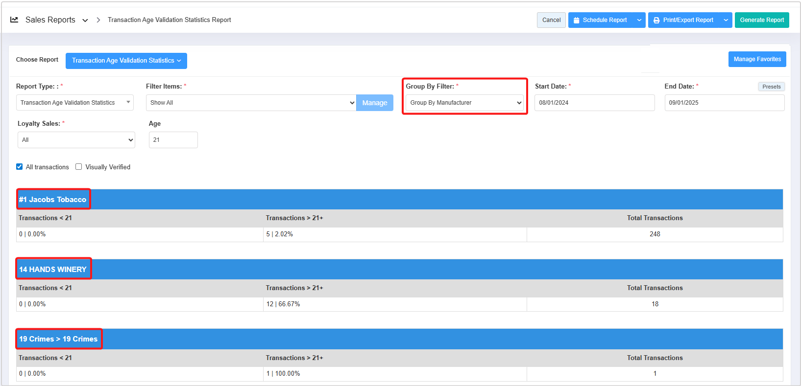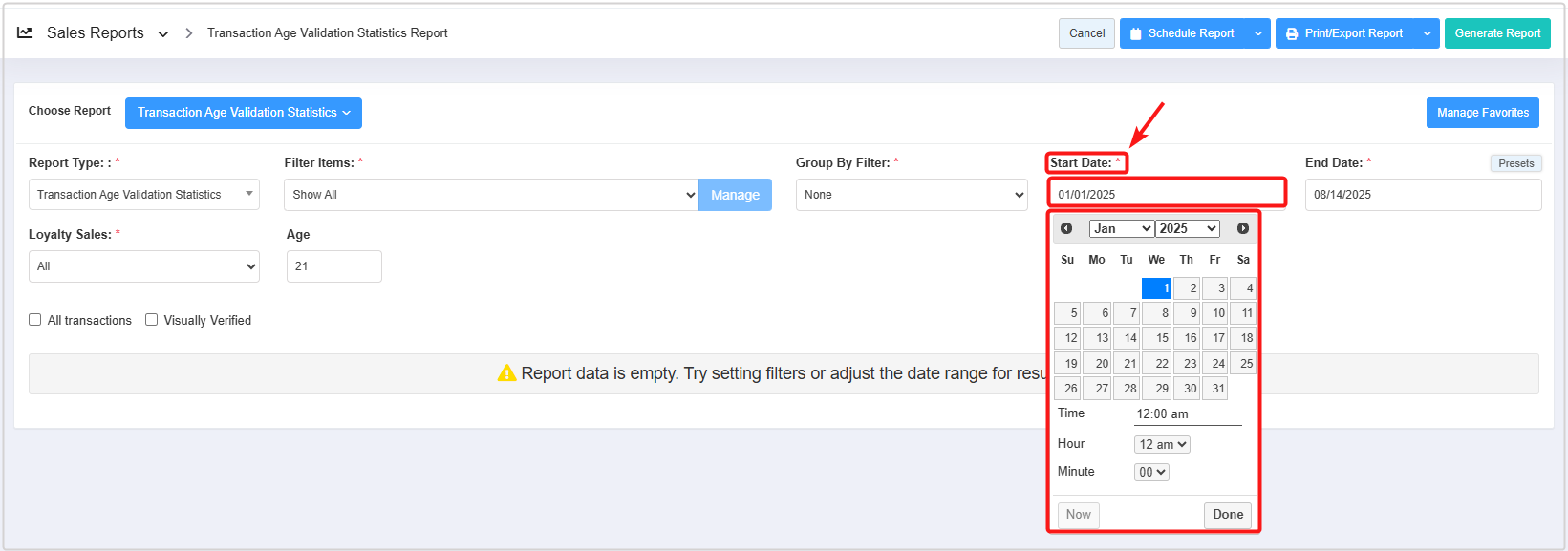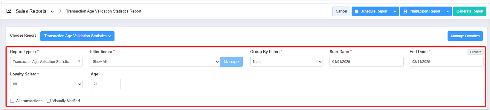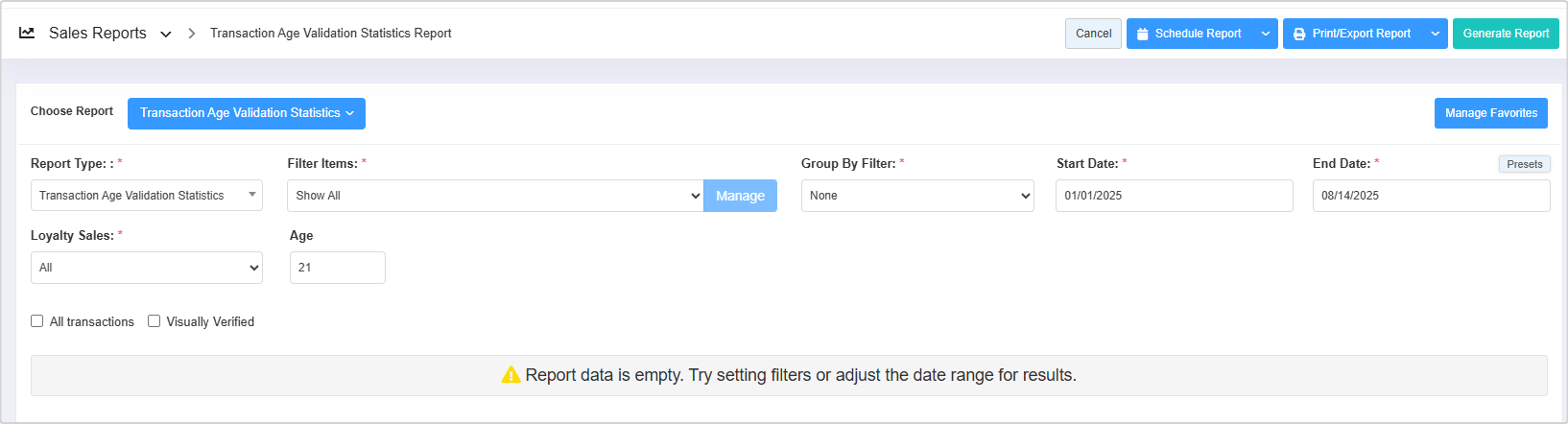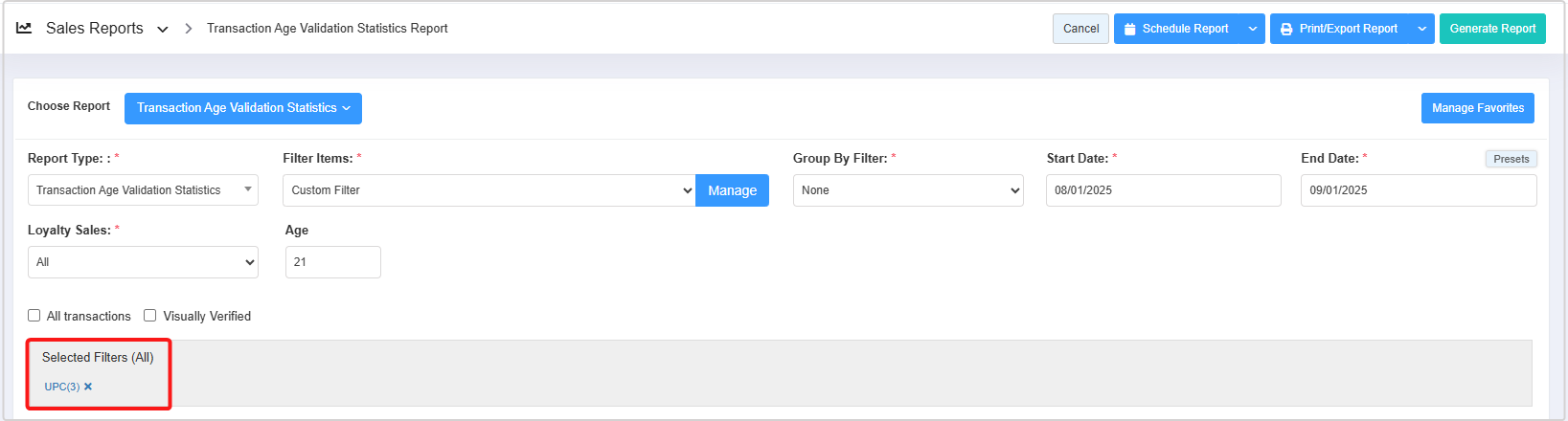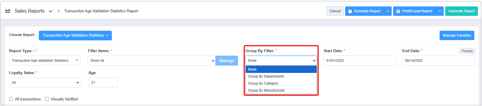 The Report Type filter lets you generate two types of reports: Transaction Age Validation Statistics and Age Group.