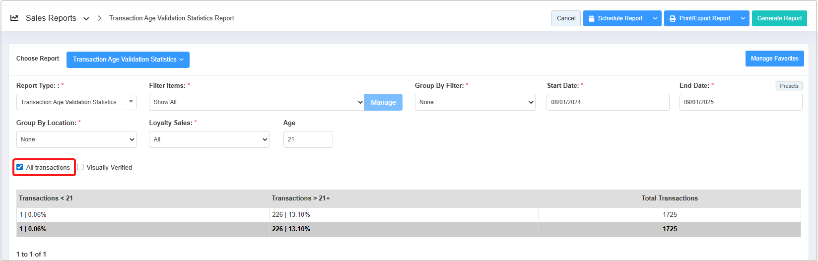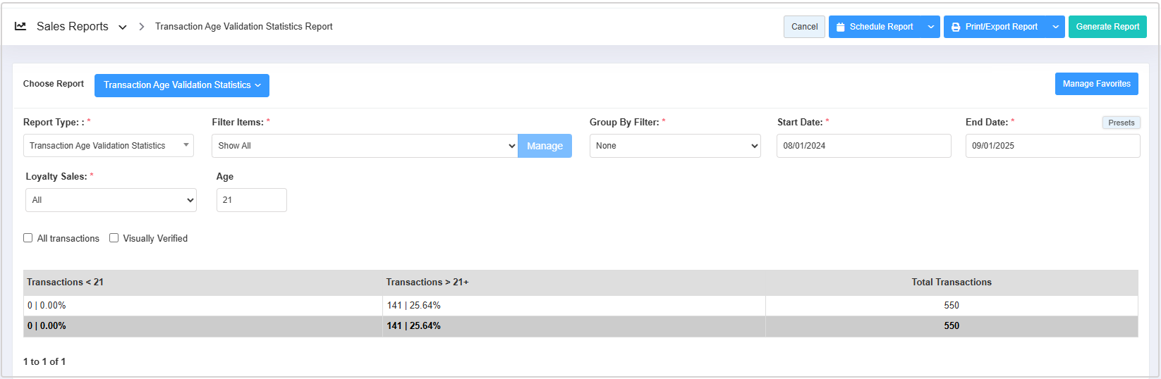 "The Transaction Age Validation Statistics Report" allows you to view the total number of transactions within a specified date range that meet or do not meet a defined age requirement.