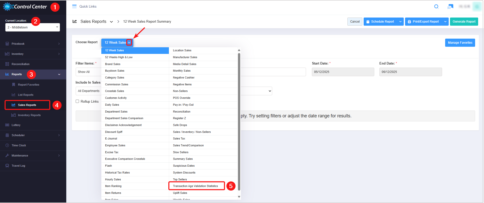 - 1: Saved Filters Drop-Down: Select the saved custom filters from the Manage Filters drop-down (if any) and click "Apply" to apply the saved custom filter. The system will redirect you to the Transaction Age Validation Statistics Report home screen. Click "Generate Report" to generate the report for the selected filter.