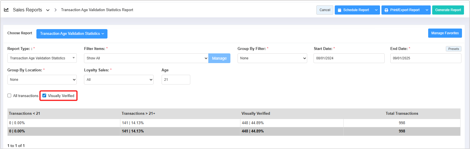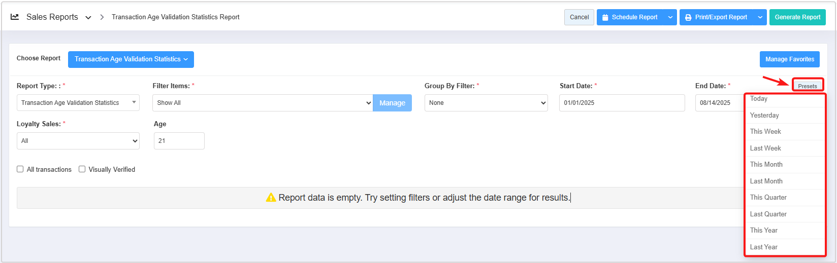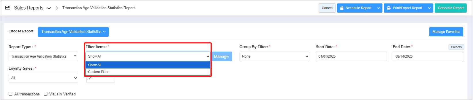 - You can use the Report Type, Filter Items (Custom Filters), Group By Filter, Date Range & Presets, Loyalty Sales filters, and All Transactions, and the Visually Verified checkbox filters to create the report that meets your requirements. You can use multiple filters to make the report more specific. Please refer to point 3. Report Filter Options, to learn more about these filters.